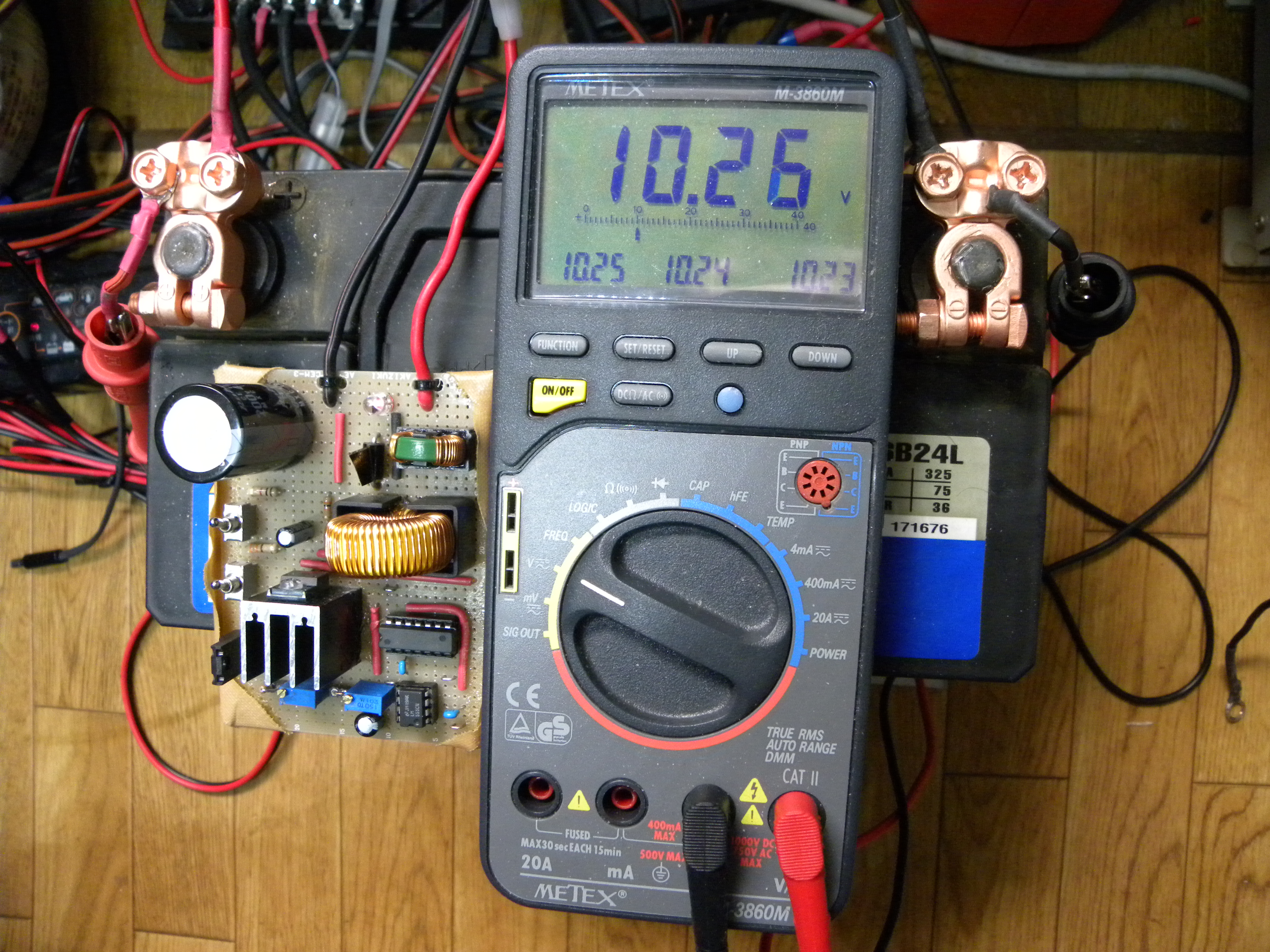 この接続電線をもっと太く短くして、バッテリーターミナルのパルス電圧を高くしようとも思いましたが、サルフェーション防止には電圧より鋭いパルスが重要なようなので、また、このままで良い結果も出ております事でもあります故、このままで遊んでみることにしました。
