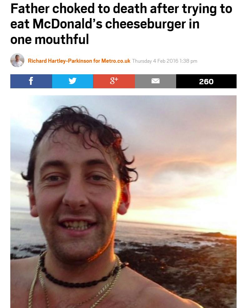 29歳男性 「マックのチーズバーガーをひと口で食べてみせる」 → 窒息死