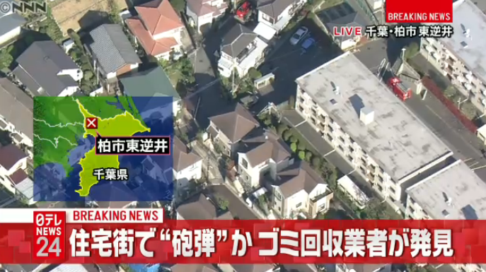11日昼前、千葉県柏市の住宅街にあるゴミ置き場で砲弾のような不審物が見つかり、午後3時50分現在、近隣住民約70人が避難している。