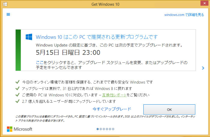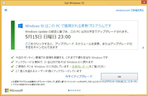 ユーザーがアップグレードの予定を変更・キャンセルしないと、指定時間にWindows 10にアップグレートされるようになっています。これまでもWindows 10へのアップグレードを促す画面は表示されていましたが、ユーザーが自分でOKを押した場合のみアップグレードが予約されるようになっていました。