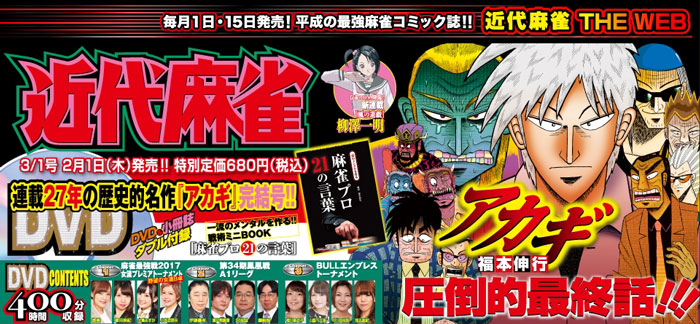 福本伸行「アカギ~闇に降り立った天才~」が、本日2月1日発売の近代麻雀3月1日号(竹書房)にて完結を迎えた。最終回となる306話は巻頭カラーを飾り、大増ページでの掲載となっている。