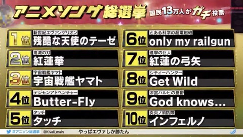 【悲報】NHK実施の平成を飾るアニソンゲーソンランキングがカオスすぎるwwwwwwwww