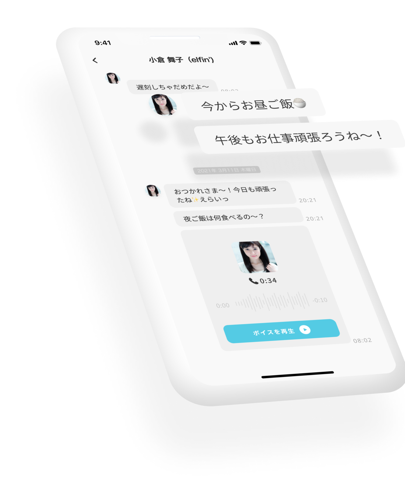 メッセージはテキスト、画像、音声、動画の4パターンで送られ、特に音声が届く場合は、本人から実際に着信が来たかのような体験ができます。